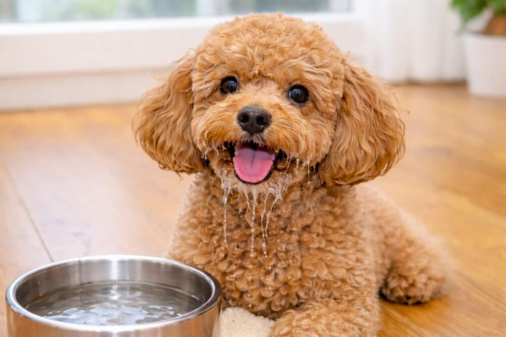 トイプードルやシュナウザーなど、口周りの毛が長い犬種にとって「お水を飲んだ後のビショビショ問題」は深刻です。 濡れたまま放置すると、床が汚れるだけでなく、雑菌が繁殖して「よだれやけ(被毛の変色)」や皮膚炎の原因になってしまいます。